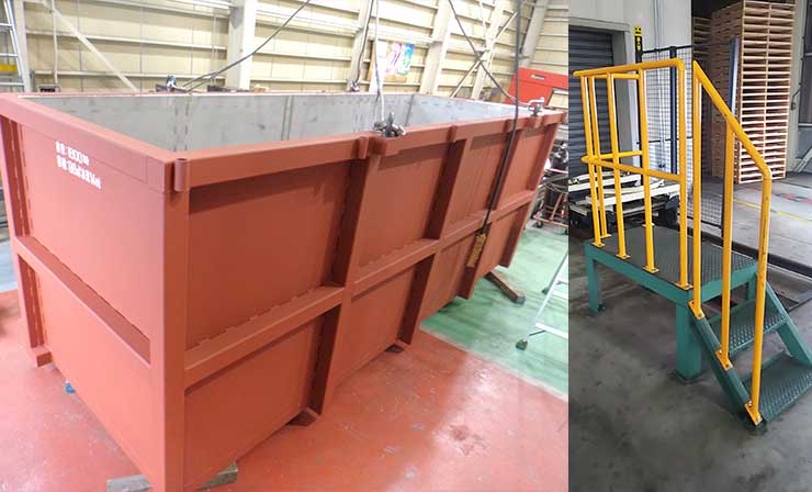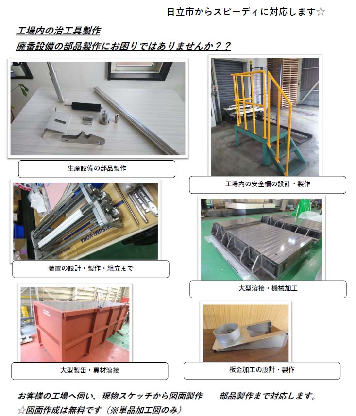 鉄・ステンレス・アルミの溶接加工から、機械加工、樹脂加工、設計支援、現地据付までを弊社の協力工場と共にサポートします。